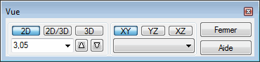 Après la sélection de l’option 2D/3D, les boutons XY, XZ et YZ deviennent disponibles et permettent de sélectionner le plan de travail. La liste de sélection située sous ces boutons contient les options suivantes : vue haut, bas, avant, arrière, gauche et droite, ainsi que SW, SE, NW et NE, qui sont des vues isométriques pour lesquelles le point de l’observation est situé, respectivement, au sud-ouest, au sud-est, au nord-ouest et au nord-est.