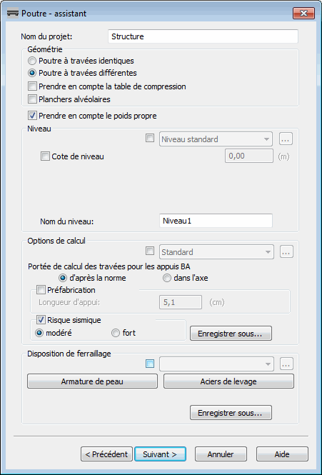 si l'option permettant la sélection d'un fichier dans la liste de sélection des fichiers contenant les paramètres des options de calcul est désactivée, les options restantes dans le champ Disposition d'armature deviennent alors accessibles ; si un tel paramètre est sélectionné, les paramètres définis dans ce champ seront alors pris en compte dans les calculs ; appuyez sur le bouton Enregistrer sous permet d'enregistrer dans un fichier les paramètres suivants : Armature de peau (lorsque vous appuyez sur ce bouton, une boîte de dialogue supplémentaire s'affiche), Aciers de levage (lorsque vous appuyez sur ce bouton, une boîte de dialogue supplémentaire s'affiche), Prendre en compte la reprise du bétonnage.