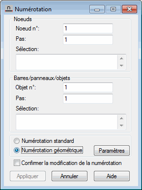 Sélection - liste des objets (barres, panneaux, arcs, etc.) dont les numéros seront modifiés. La nouvelle numérotation des objets est définie par deux paramètres : le numéro du premier objet et le pas d'incrémentation de la numérotation. |