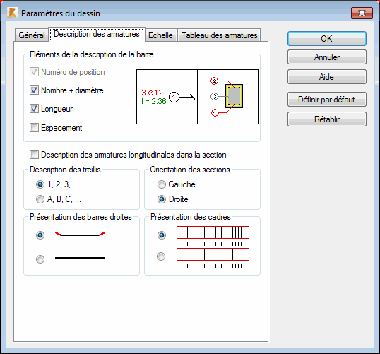 (Paramètres du dessin), puis sélectionnez l’onglet Description des armatures.
