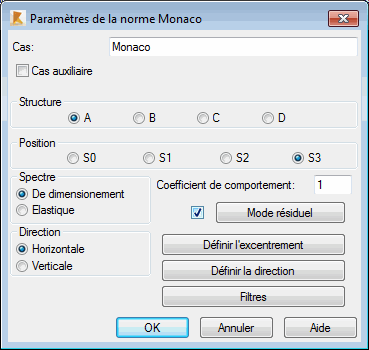 Les paramètres de l’analyse sismique des structures dépendent de la norme parasismique sélectionnée pour le calcul des structures sollicitées par des charges sismiques. Sélectionnez la norme sismique monégasque dans la boîte de dialogue Définition d'un nouveau cas ou cliquez sur Paramètres dans la boîte de dialogue Type d'analyse.