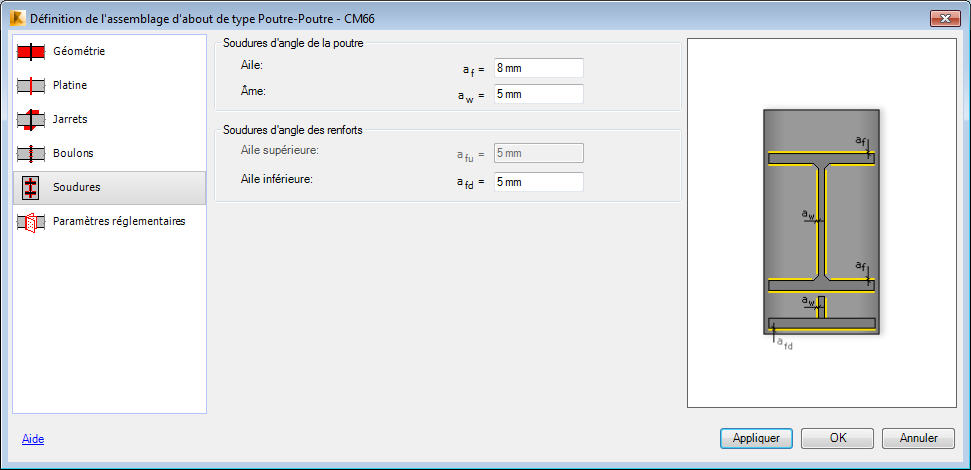 L'onglet Soudures contient les options permettant de définir l'épaisseur des soudures assemblant la poutre à la platine d'about et de celles assemblant les renforts.