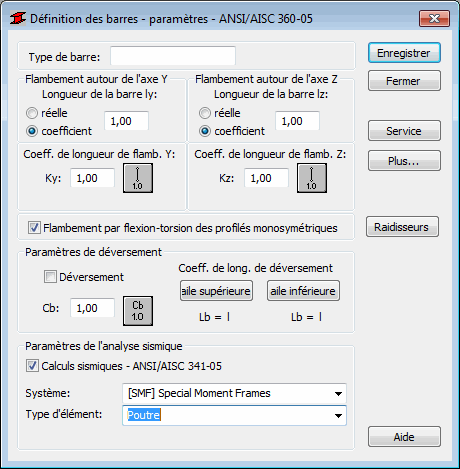 La partie inférieure de la boîte de dialogue contient l’option Calculs sismique - ANSI/AISC 360-05. Si cette option est cochée, lors du dimensionnement des éléments acier, le logiciel vérifie les conditions supplémentaires qui doivent être satisfaites par les éléments porteurs en acier soumis aux sollicitations sismiques. Le jeu de règles à satisfaire pour les charges sismiques est basé sur la norme ANS/AISC 341-05 – ‘Seismic Provisions for Structural Steel buildings - Including Supplement No.1’. Le contrôle des éléments acier de la structure sollicitée par les charges sismiques consiste à vérifier les sections acier conformément à la norme acier américaine ANSI/AISC 360-05 implémentée - ‘Specification for Structural Steel Buildings’ avec les limitations additionnelles contenues dans ANS/AISC 341-05 - 'Seismic Provisions for Structural Steel Buildings'.