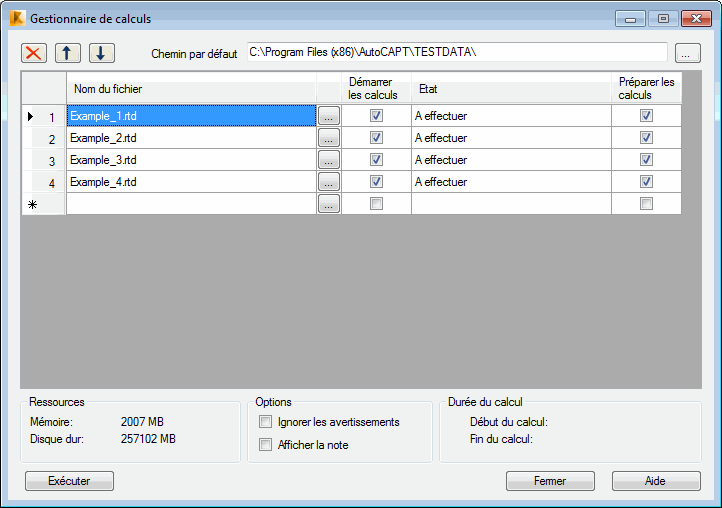 Un tableau répertoriant les fichiers de modèle de structure s'affiche dans la partie centrale de la boîte de dialogue. L'ordre des fichiers détermine l'ordre des performances. Les paramètres de chaque fichier de modèle de structure concernant les calculs peuvent être sélectionnés.