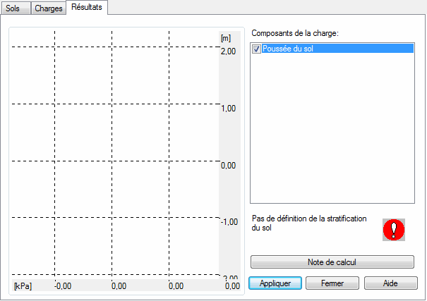 - La partie gauche de la boîte de dialogue affiche une section transversale du sol avec un diagramme de charge ; le diagramme présente le cas sélectionné dans la liste ; pendant que vous déplacez le pointeur de la souris sur le diagramme, il est possible de lire les valeurs dans les points successifs du diagramme