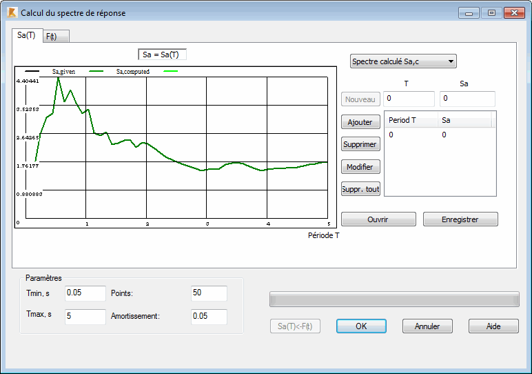 Pour définir une nouvelle fonction, cliquez sur Nouveau. Les boutons Ajouter, Supprimer et Modifier servent à éditer la ligne sélectionnée dans le tableau contenant les colonnes Période T et Sa. Un clic sur le bouton Supprimer permet de supprimer tous les spectres.
