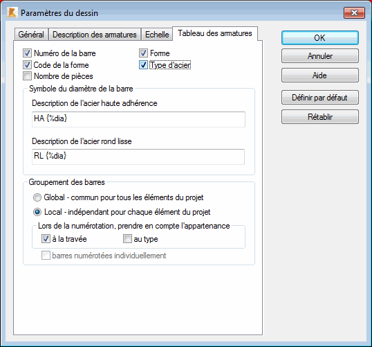 (Paramètres des plans) et sélectionnez l’onglet Tableau des armatures.