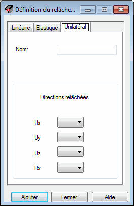 Après la sélection de l’onglet Unilatéral, la boîte de dialogue Définition du relâchement s'affiche comme illustré ci-dessous.