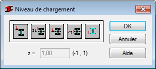 Afin de définir correctement les paramètres de déversement, la définition du niveau de chargement est nécessaire. Le niveau de chargement est défini comme l’ordonnée de la hauteur de l’application de la charge mesurée dans le repère défini par les axes de la section de la barre. Si le déversement se produit seulement à la suite du chargement agissant dans le plan XZ, il suffit de saisir seulement une coordonnée. Il s'agit d'une valeur arbitraire comprise dans l'intervalle <-1.0,1.0>. Si la charge est appliquée dans un point caractéristique de la section (aile supérieure, aile inférieure etc.), il suffit de sélectionner l’icône appropriée, la valeur de la coordonnée sera prise automatiquement.
