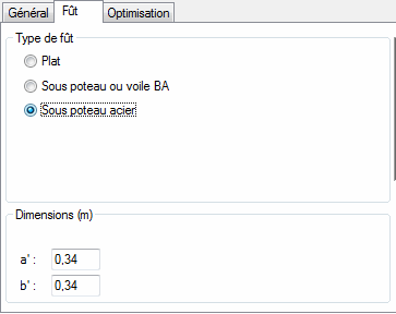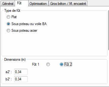 Si l'option Semelle pour deux poteaux est sélectionnée dans l'onglet Général, le contenu du champ Dimensions change. Vous pouvez déterminer les dimensions géométriques d'un assemblage poteau/semelle pour chacun des fûts séparément. Le type de fût est identique pour tous les fûts.