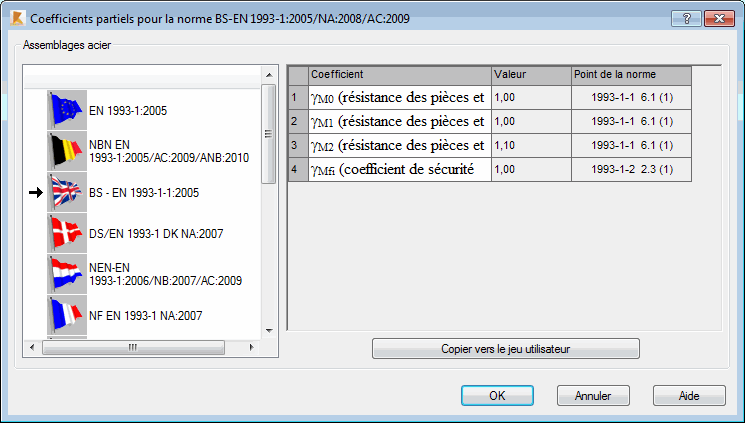 La boîte de dialogue Coefficients partiels permet d’éditer les coefficients de matériau pour les modules réglementaires (pour la norme Eurocode sélectionnée).