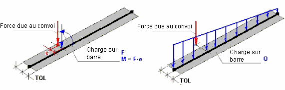 Cette option est étroitement liée au paramètre Tolérance décrit ci-dessus. Le moment dû à l’excentrement de la force concentrée F sera généré uniquement si la distance entre le point d’application de la force concentrée et la barre est inférieure à la tolérance définie (TOL < e). La force concentrée F et le moment concentré M = F*e seront appliqués à la barre (cf. la figure ci-dessous).