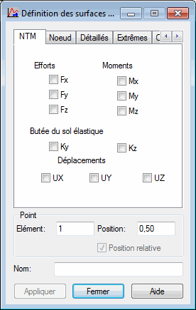 La fonction est définie après la sélection d’une valeur sur un onglet quelconque et la sélection d’un élément ou noeud. Pour les structures à barres, la fonction Position est également disponible. Cette fonction permet de définir la coordonnée relative sur la barre, pour laquelle le logiciel enregistre les résultats. Pour les éléments surfaciques, les valeurs des forces et contraintes sont lues dans les centres des éléments.