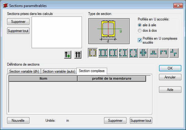 Pour accéder à l'option, cliquez sur l'onglet Section complexe dans la boîte de dialogue Sections paramétrables. Le logiciel affiche la boîte de dialogue ci-dessous :