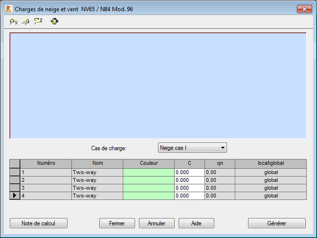Si les cas de charge définis n’ont pas de nature neige ou vent, le tableau est vide. De même que pour le cas de vent, il est possible de modifier certains coefficients.