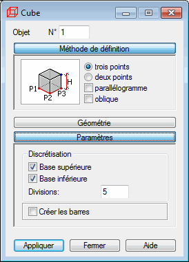 Quand la boîte de dialogue Cube s'affiche dans sa forme maximale, après un clic sur l'un des trois boutons (Méthode de définition, Géométrie et Paramètres), la partie correspondante de la boîte de dialogue est réduite au bouton même. Dans sa forme réduite, un clic sur un des boutons rétablit la partie correspondante de la boîte de dialogue.