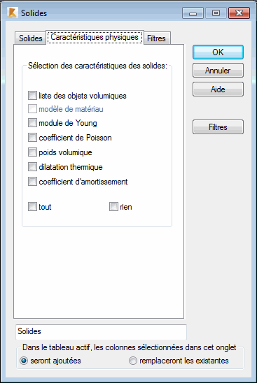 Sélectionnez l'onglet Propriétés physiques dans la boîte de dialogue Colonnes afin de sélectionner les propriétés solides pour la présentation.