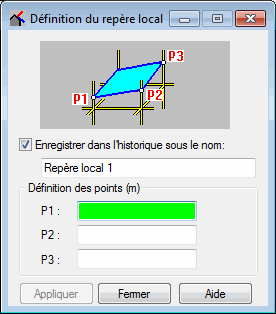 Sous Définition des points dans la boîte de dialogue Définition du système local, vous pouvez définir les points déterminant le plan de travail local : P1, P2 et P3. Le premier point (P1) est également le début du système de coordonnées local.