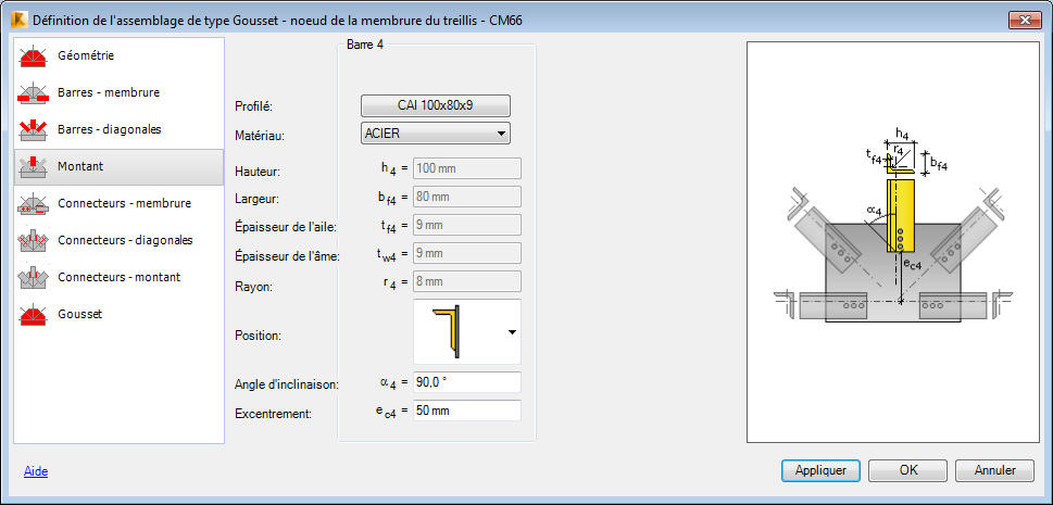 L'onglet Montant comprend les options permettant de définir les principaux paramètres du montant aboutissant au gousset :
