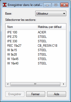 La boîte de dialogue Enregistrer dans la base de données permet d'enregistrer une section dans la base de données de sections sélectionnée. Pour ouvrir cette boîte de dialogue, cliquez sur l’icône Enregistrer