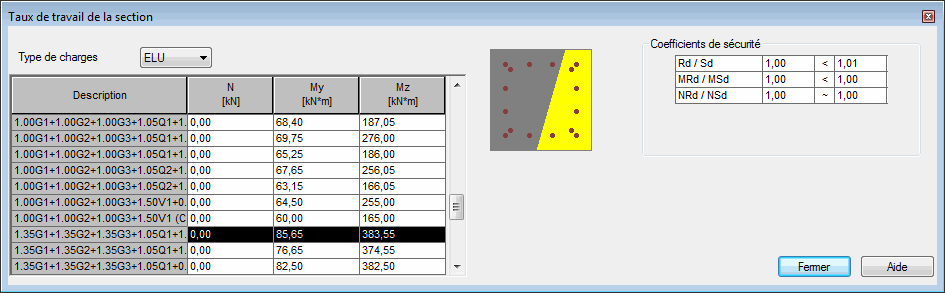 Après avoir calculé ou vérifié le poteau, vous pouvez ouvrir la boîte de dialogue Taux de travail de la section représentée sur la figure ci-dessous.