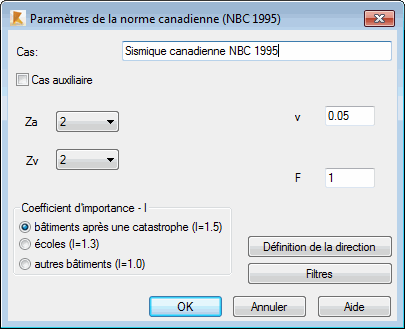 Les paramètres de l’analyse sismique des structures dépendent de la norme parasismique sélectionnée pour le calcul des structures sollicitées par des charges sismiques. Sélectionnez la norme sismique canadienne NBC 1995 dans la boîte de dialogue Définition d'un nouveau cas ou cliquez sur Paramètres dans la boîte de dialogue Type d'analyse.