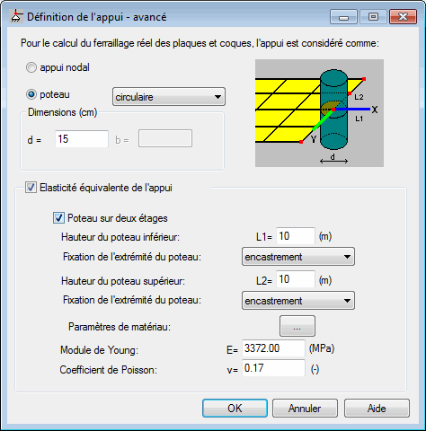 Dans la partie inférieure de la boîte de dialogue, l’option Elasticité équivalente de l’appui est disponible ; si cette option est cochée, il est possible de calculer l’élasticité équivalente des appuis à partir des propriétés et de la géométrie des poteaux (en cas d’appuis nodaux) ou des voiles (en cas d’appuis linéaires).