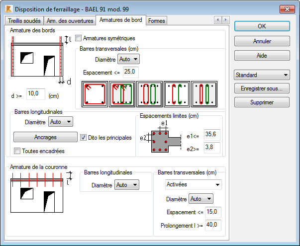 De plus, pour la méthode générale BAEL, il est possible d'utiliser l'option Armatures symétriques. Cette option permet de générer les armatures de bord symétriques (pour les valeurs maximales des armatures et la largeur des zones masquées).
