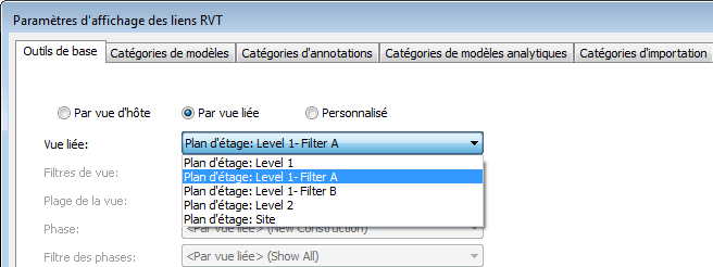 - Pour l'option Vue liée, sélectionnez la vue du modèle lié dont vous souhaitez utiliser les paramètres d'affichage pour le modèle lié de la vue d'hôte active.