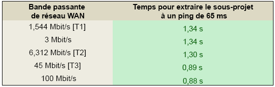 Si le volume de données déplacé sur le réseau est petit, la bande passante nécessaire est très modérée. Dans cet exemple, un sous-projet contenant environ 18 000 éléments est extrait. (Le nombre d'éléments a une incidence très limitée sur le temps requis pour terminer l'opération.) Notez que le temps nécessaire pour terminer l'opération ne change pas de façon significative avec l'augmentation de la bande passante disponible : bien que l'accès s'effectue via le réseau WAN, la quantité de données transmises est très faible. D'autres opérations effectuées avec une charge réseau aussi faible (telles que l'emprunt ou l'abandon d'un élément) donnent des résultats similaires.