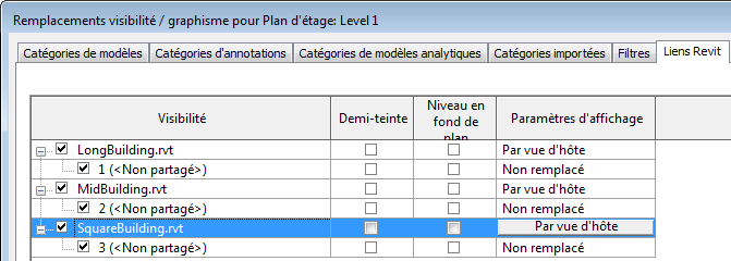 L'onglet Liens Revit de la boîte de dialogue Visibilité/Graphismes contient les colonnes suivantes :