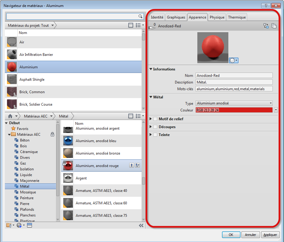 Dans le navigateur de matériaux, les informations s'affichent dans les onglets Identité, Graphismes et Apparence de l'Editeur de matériaux.