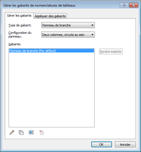 Vous pouvez utiliser la boîte de dialogue Gérer les gabarits de nomenclatures de tableaux pour modifier, dupliquer, supprimer et appliquer des gabarits de nomenclatures de tableaux. Vous pouvez également spécifier le gabarit par défaut.