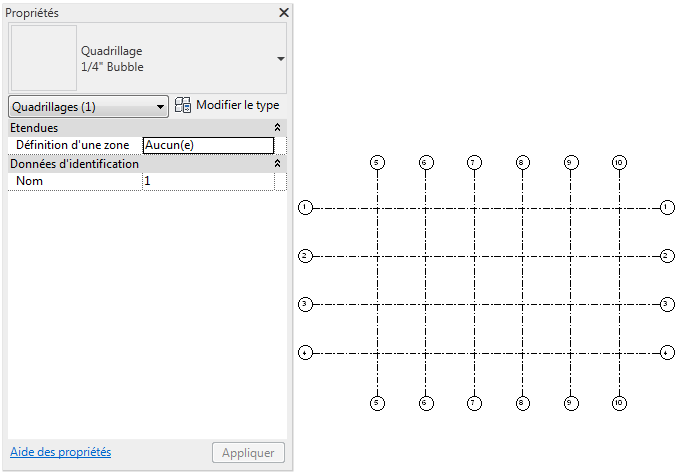 La grille AutoCAD Architecture est créée dans le plan du niveau inférieur du modèle Revit qui ne descend pas plus bas que le contour du modèle de la vue. Les blocs à vues multiples pour les bulles de quadrillage sont ancrés sur les extrémités des lignes de quadrillage et seront créés sur le même plan.