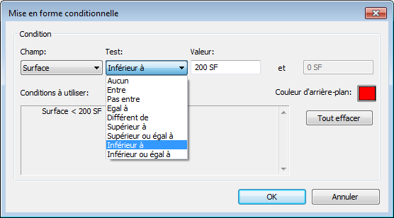 Vous pouvez utiliser la mise en forme conditionnelle notamment pour définir une condition indiquant qu'une superficie en pieds carrés est inférieure à une valeur minimum spécifiée, ou si la quantité adéquate d'écoulement d'air est apportée à chacune des pièces du modèle.