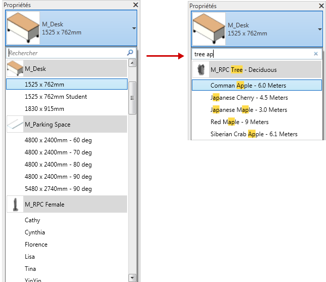 Revit pour faciliter la sélection à partir d'une longue liste d'options. Vous pouvez effectuer une recherche dans les zones fonctionnelles suivantes :