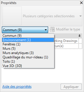 Sous le sélecteur de type, un filtre identifie la catégorie des éléments allant être placés par un outil ou la catégorie et le nombre d'éléments sélectionnés dans la zone de dessin. Si plusieurs catégories ou types sont sélectionné(e)s, seules les propriétés d'occurrence communes à tous s'affichent dans la palette. Lorsque plusieurs catégories sont sélectionnées, utilisez la liste déroulante du filtre pour afficher uniquement les propriétés d'une catégorie ou de la vue. La sélection d'une catégorie spécifique n'a pas d'incidence sur l'ensemble du jeu de sélections.
