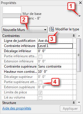 Dans la plupart des cas (voir les exceptions dans la remarque ci-dessous), la palette Propriétés affiche les propriétés d'occurrence en lecture seule (grisées) et celles modifiables par l'utilisateur. Une propriété peut être en lecture seule lorsque sa valeur est calculée ou affectée automatiquement par le logiciel ou lorsqu'elle dépend du paramètre d'une autre propriété. Par exemple, la propriété Hauteur non contrainte d'un mur n'est modifiable que si la valeur de la propriété Contrainte supérieure est définie sur Sans contrainte. Pour connaître des dépendances particulières, voir les descriptions des propriétés d'occurrence pour les différents types d'éléments.