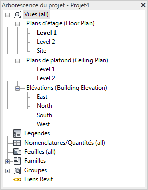 L'arborescence du projet correspond à une hiérarchie logique de l'intégralité des vues, nomenclatures, feuilles, groupes et autres parties du projet actif. A mesure que vous développez l'arborescence, les éléments du niveau inférieur s'affichent.