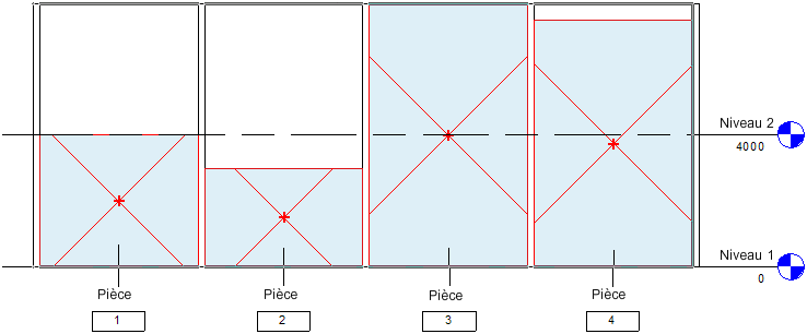 Par exemple, supposons qu'une pièce commence au niveau 1. Pour indiquer qu'elle doit s'étendre jusqu'à 4000 mm au-dessus du niveau 2, définissez Limite supérieure sur Niveau 2 et Décalage limite sur 4000 mm. Par défaut, la valeur du paramètre Décalage limite correspond à la distance entre les niveaux (10’ ou 4000 mm).