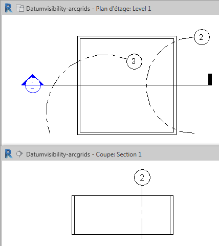 Les lignes de quadrillage en arc s'affichent dans les vues en coupe lorsque le centre de l'arc croise la ligne de coupe et lui est perpendiculaire.
