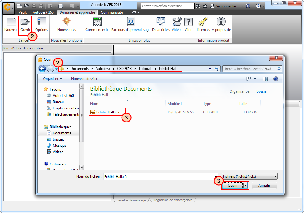 2. Dans le groupe de fonctions Lancer, cliquez sur Ouvrir, puis sélectionnez C:\Users\Public\Public Documents\Autodesk\CFD 2018\Tutorials\Exhibit Hall.