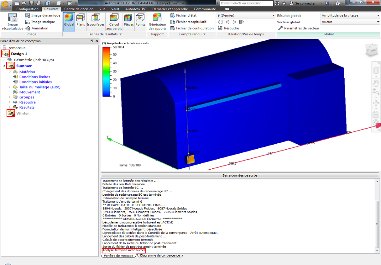 Remarque : Lorsque les deux simulations sont terminées, les icônes "Exécution" deviennent invisibles dans la barre Etude de conception et "Analyse terminée avec succès" s'affiche dans la barre données de sortie :