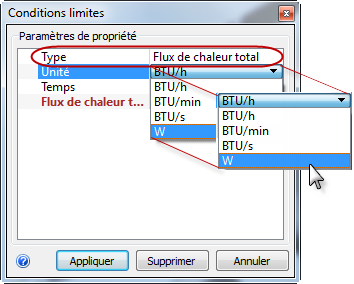 5. Vérifiez que le Type est réglé sur Génération de chaleur totale. En outre, définissez les unités en watts en sélectionnant W dans la ligne Unité.
