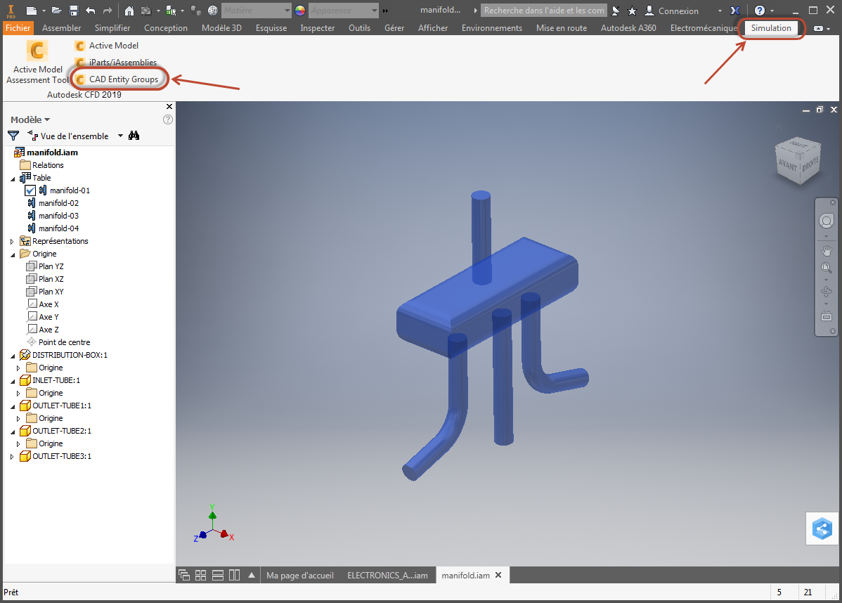 Par exemple, si vous effectuez le lancement dans Autodesk® Inventor, cliquez sur Simulation et sur Groupes d'entités de CAO: