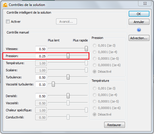 Cliquez sur le bouton Contrôle de la solution et déplacez le curseur Pression sur 0,25