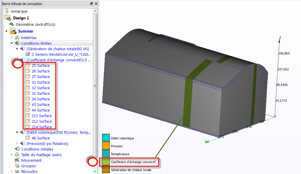 15. Pour vérifier que la condition aux limites du coefficient de transmission superficielle est correctement appliquée à la surface extérieure, vérifiez la barre Etude de conception et la bande de couleur sur les surfaces :