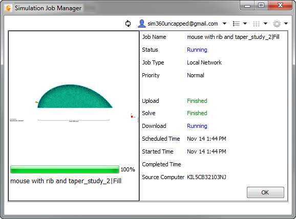 - Download: The process of copying the simulation results data back to the local workstation. When the Download stage reaches Finished, the simulation is complete and results are ready for visualization on the local computer. Note, there are times when the Download stage shows as Running at the same time as the Solve stage. This is done to support download of intermediate results.