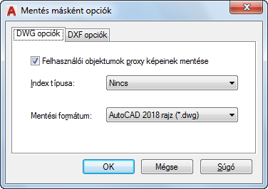 Ha egy korábbi formátumban ment, vagy a rajz másik alkalmazásból származó felhasználói objektumokat tartalmaz, a felhasználói objektumok képeinek a rajzfájlba mentéséhez a Felhasználói objektumok proxy képeinek mentése lehetőséget válassza. (PROXYGRAPHICS rendszerváltozó)