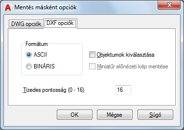 Megadja, hogy a program ASCII vagy bináris DXF-fájlt hozzon-e létre. Az ASCII formátumú DXF-fájlok szövegszerkesztővel olvashatók, és az alkalmazások széles körével kompatibilisek. A bináris formátumú DXF-fájlok kisebb méretűek. A bináris formátumú fájlok esetében az olvasási és írási műveletei gyorsabbak, mint az ASCII-formátumú fájlok esetében.